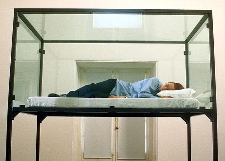 The first thing I saw was a slim figure sleeping inside the glass box. A simple white linen covered the makeshift bed, while the figure rested with its back to me. I immediately noticed that it was a female frame, the white blonde hair cut short but pointy. My first impression was that it was a fantastic sculpture, but a bit underwhelming due to the prosaic nature of the…